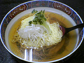 写真では分かりづらいが、丼は変わった形をしていて、底が平らになっている。そこに透明度の非常に高いスープが注がれていて、具は白髪ネギ、針金ショウガ、カイワレのみといたってシンプルです。