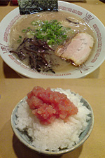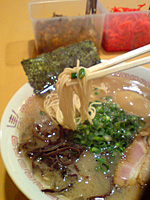 トッピングにはテーブル(またはカウンター)上のゴマ、辛子高菜、紅ショウガ、おろしニンニクを入れ放題ですが、これらを投入してみても豚骨の風味がほとんど失われないのはスープの力強さに他ならないでしょう。